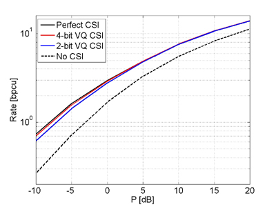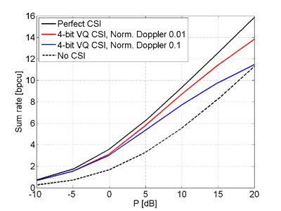 The compared scenarios are: perfect channel state information at the base station, 4 and 2-bit feedback per frame and no channel state information at the transmitter (round-robin scheduling with equal power distribution). The system has been tested with the following parameters: